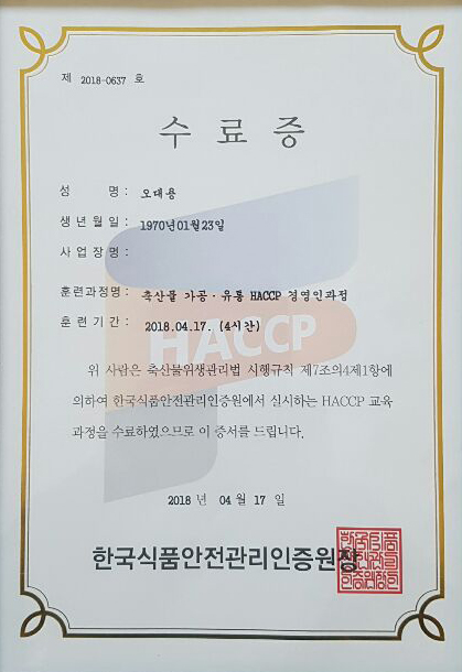 축산물 가공,유통 HACCP 경영인과정 수료증